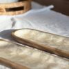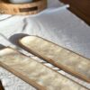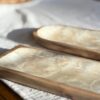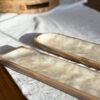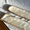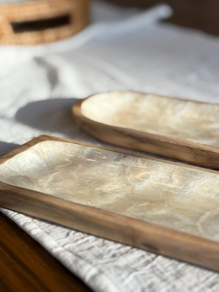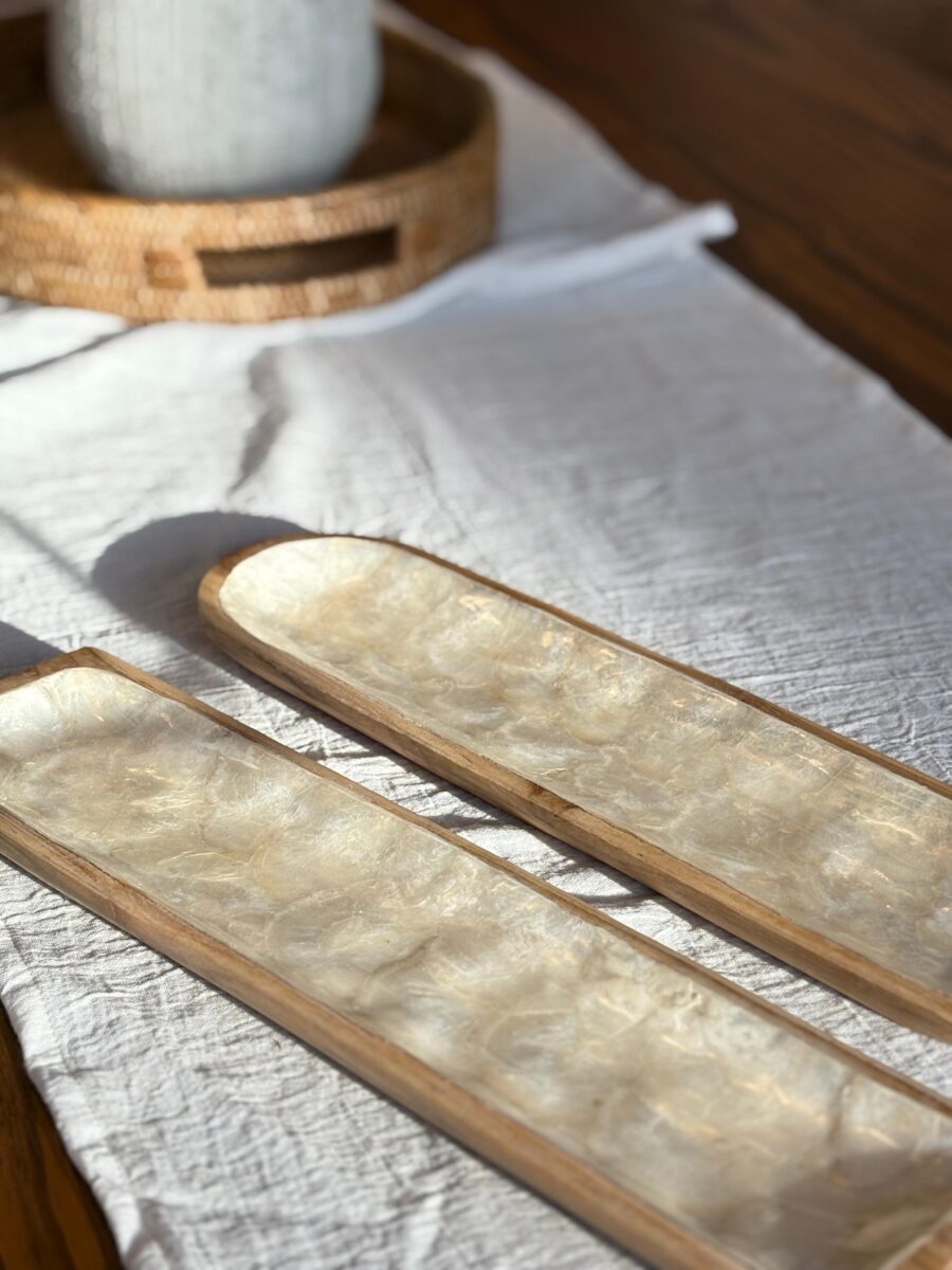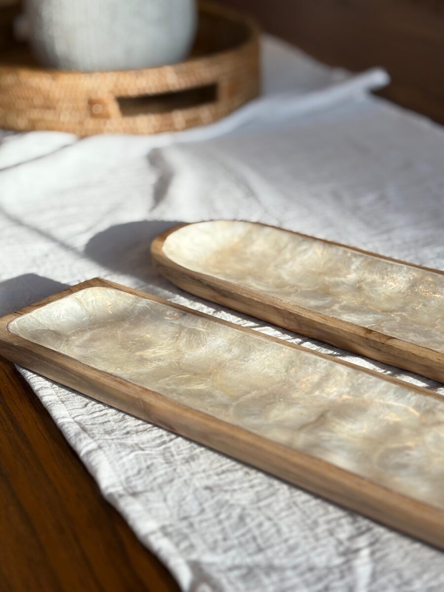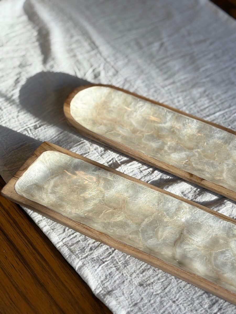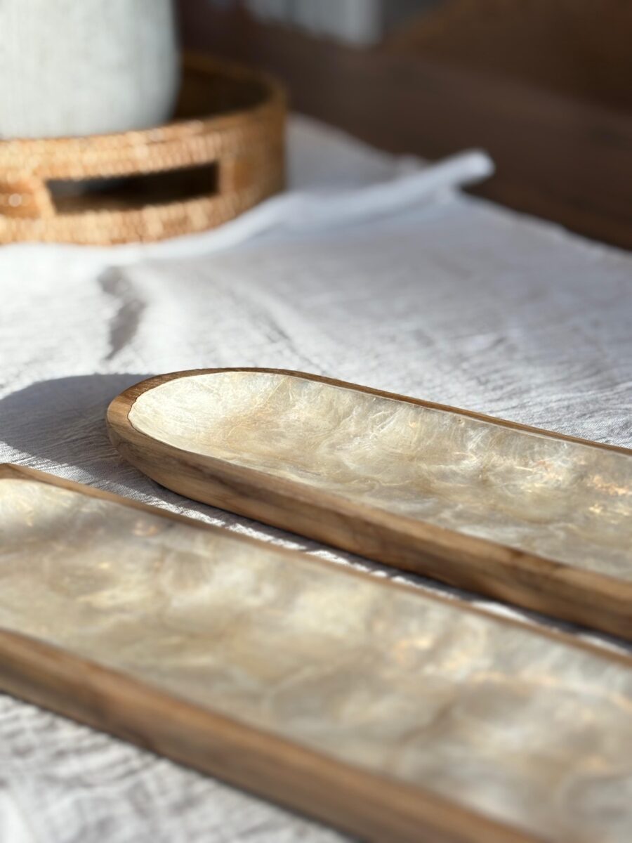 Bandeja para sushi rectangular con bordes cuadrado y terminación redondeada, base de madera con superficie nácar