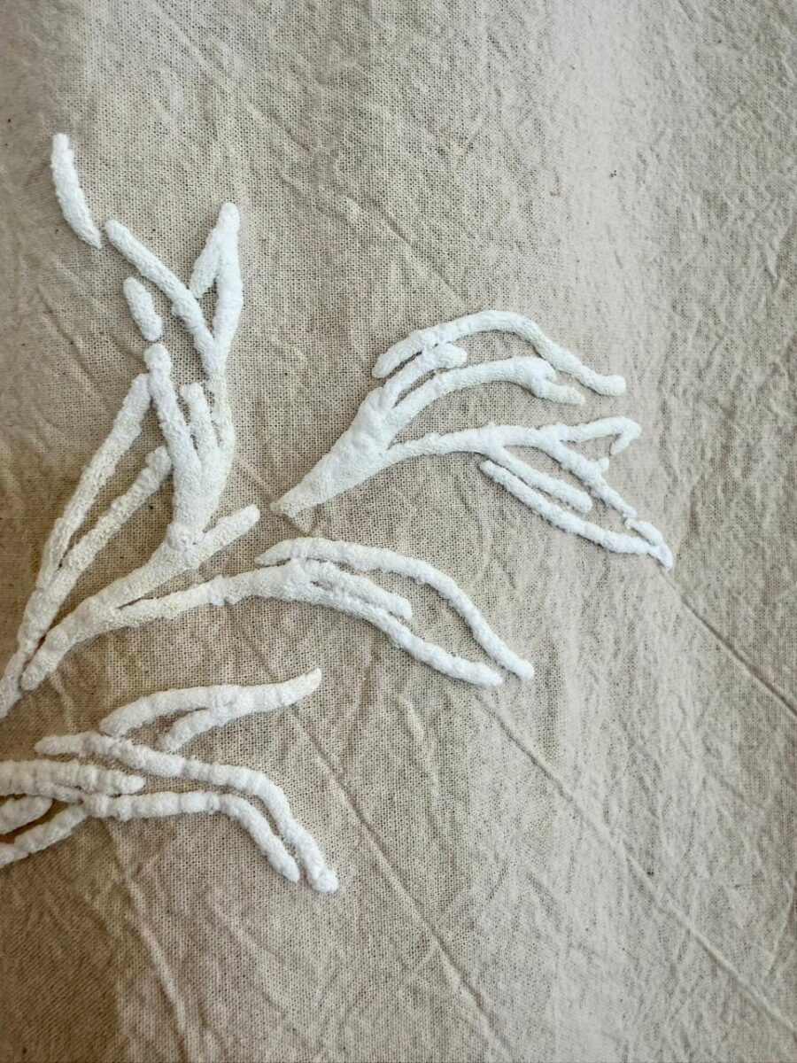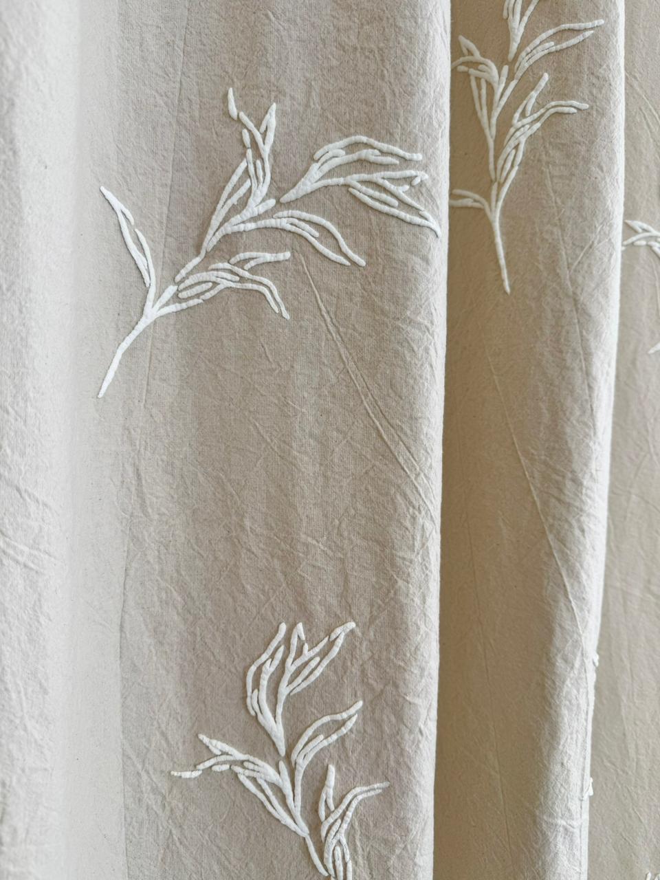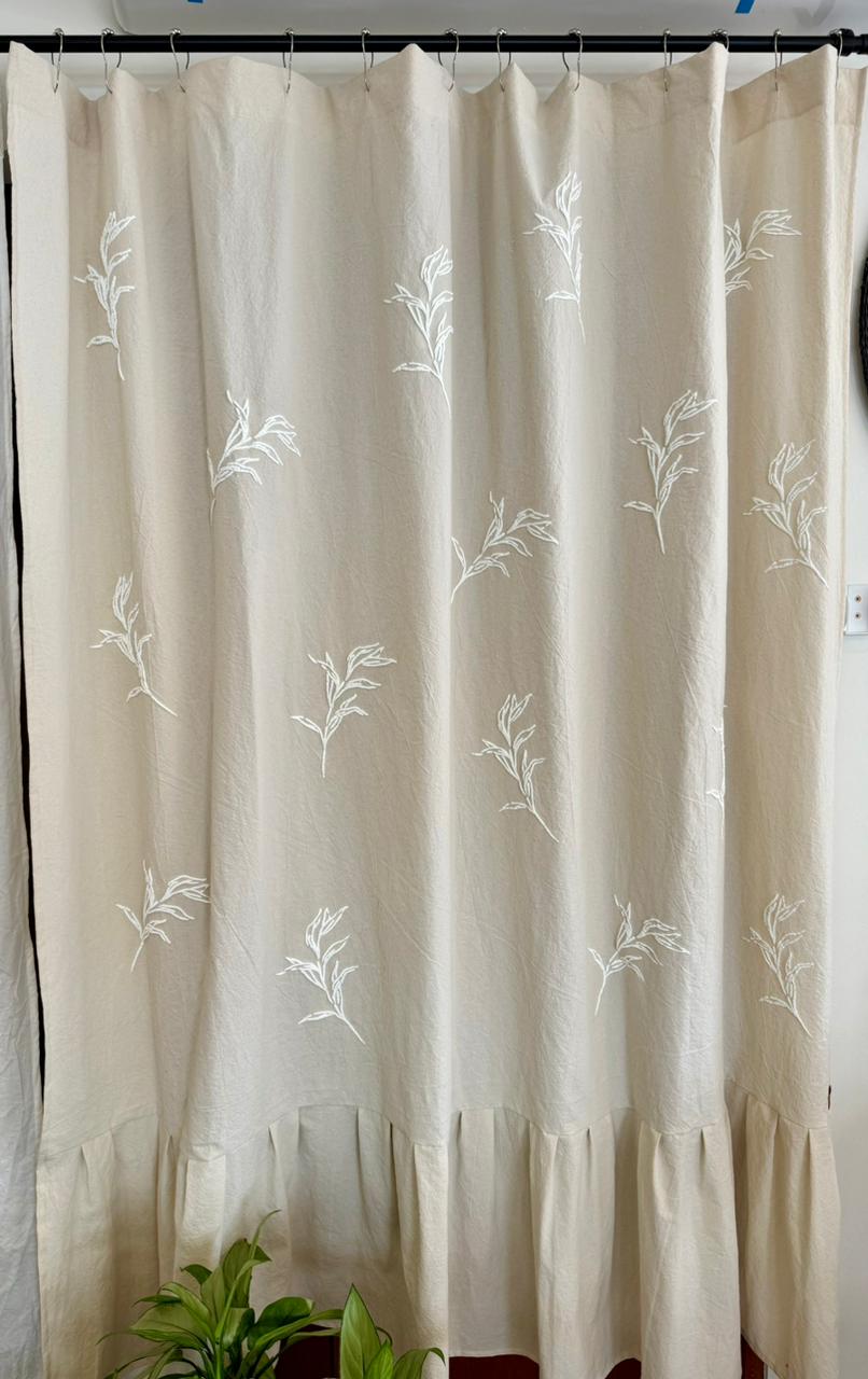 Cortina de Baño de tusor color CRUDO estampada con relieve y con vuelos, con 12 ojales.