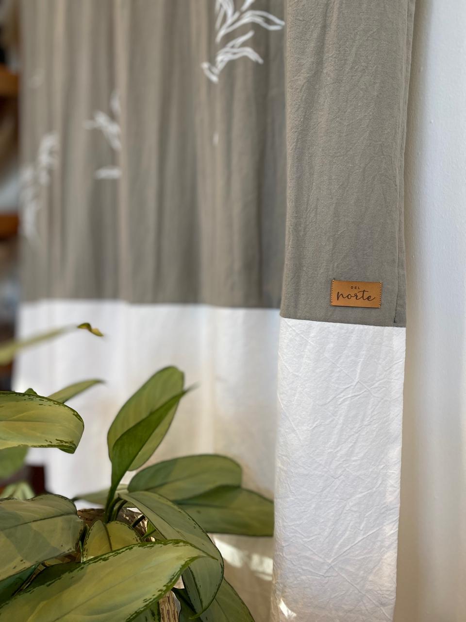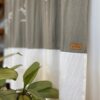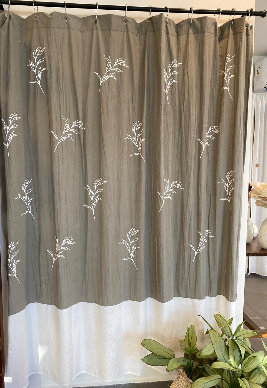 Cortina de Baño de tusor gris elefante con estampa blanca, combinada con tusor blanco.