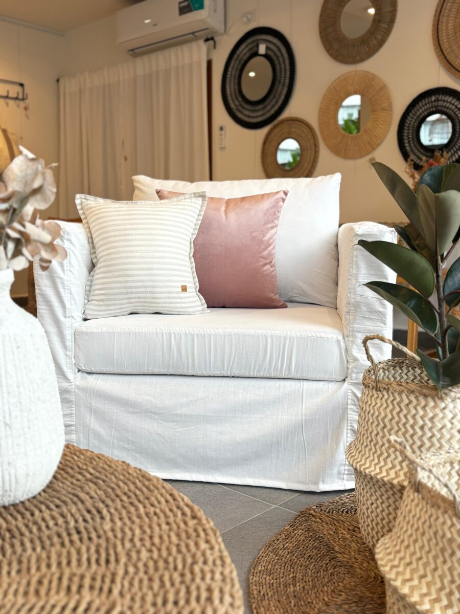 Sillon 1 cuerpo de pana beige, patas de madera. Con funda de tusor blanca.