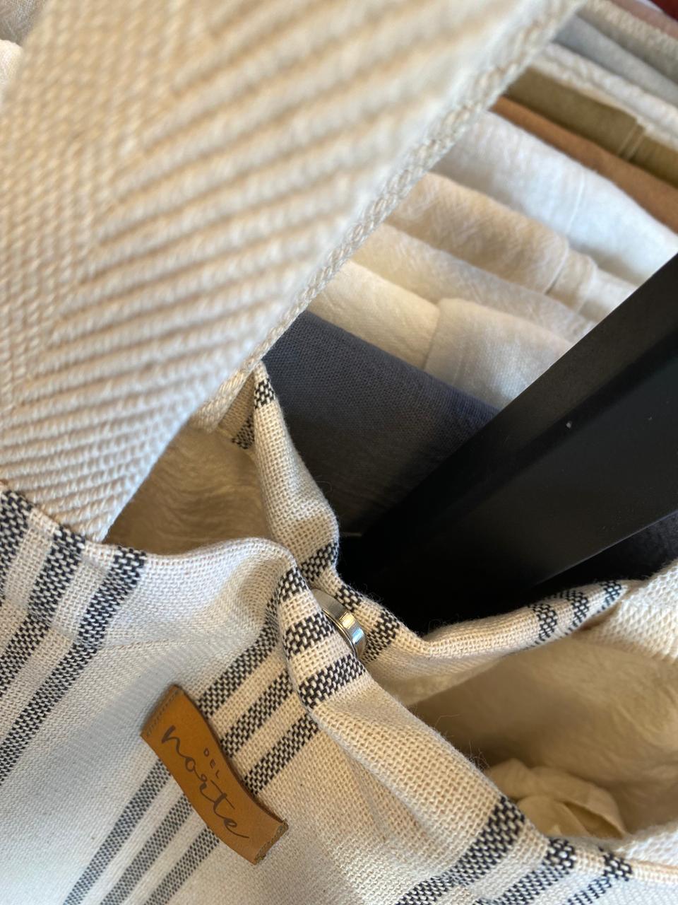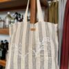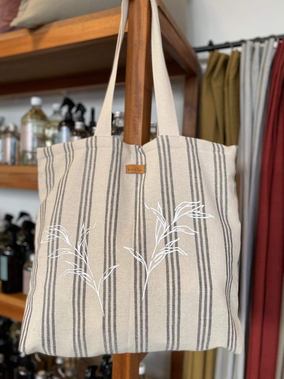Tote de tela rustica rayada con estampa blanca. 1 bolsillo interno y con cierre imán.
